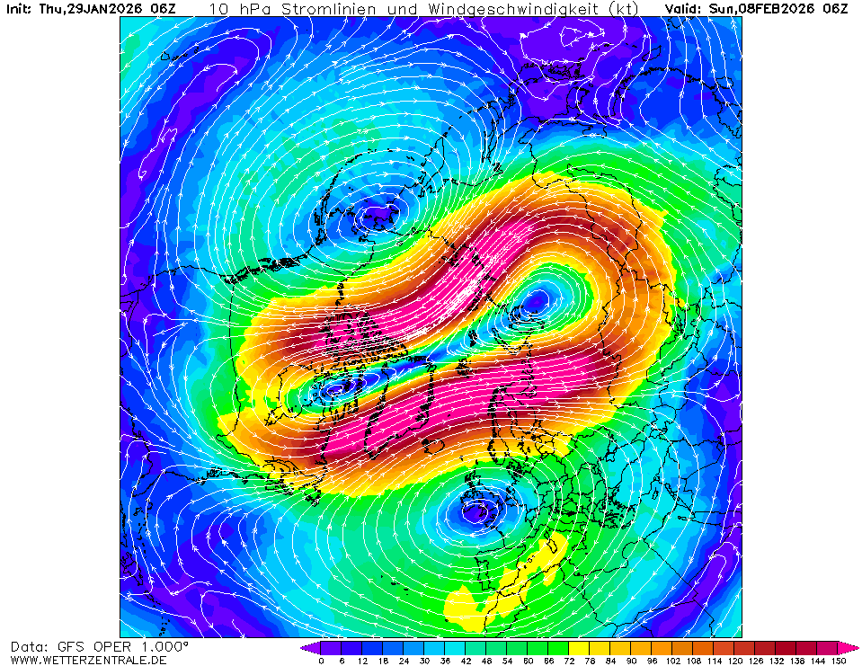 Ezen már én is gondolkoztam: nagyon magasan is van a polar jet, plusz a "sűrűsége" a ~100-ad része az itteni levegőnek (ha már 10 hPa), persze a "szélsebesség" meg sokkal nagyobb, de a sűrűség miatt - súlyozva - kisebb lehet a hatása. Azaz (nyilván csak részemről) fölmerül, hogy a 10 hPa-s időjárásnak (polar jet) van-e a mi magasságunkban az időjárásra hatása (és mekkora), vagy a mi időjárásunknak a 10 hPa-ra (coriolis erő ugyanúgy működik minden magasságban). Azaz részemről kérdés az ok-okozat iránya, esetleg a figyelembe veendő súlyok.