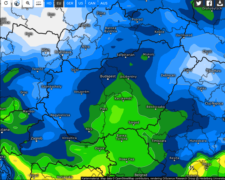 Szerda reggelig várható csapadékmennyiség GFS op. szerint. A belvárosban lucsok, viszont a külső kerületekben néhány cm hó esélyes.