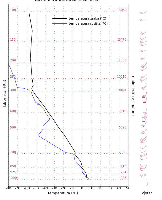 A pesti szonda szerint kb. 2000 méteren lehetett a fagyhatár. Legalábbis az egyik, ugyanis 600 méter körül volt egy inverziós réteg, fagypont közeli értékekkel, miközben 1000-en majd' 5 fok volt. Ráadásul 1500 méter alatt szinte a felszínig negatív volt a harmatpont.