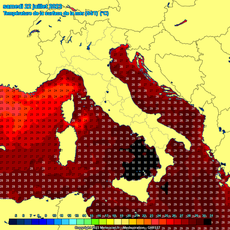 A Földközi-tengeren a tegnapi átlagos tengerfelszíni hőmérséklet elérte a 28,40°C-ot, ami a történelem legmagasabb értéke! Ez megdönti a 2003. augusztusi európai hőhullám idején felállított korábbi 28,25 fokos rekordot