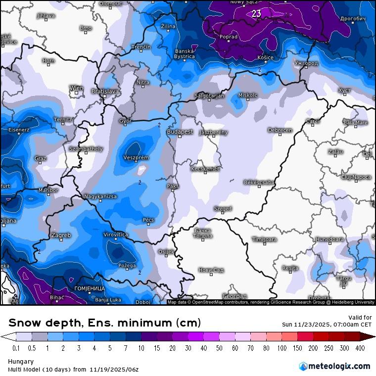 Becsült össz minimálisan várható hóvastagság vasárnap reggelig (Multi modell)