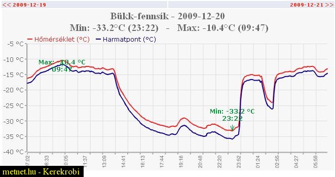 | Leírás: Bükk-fennsík fagyzug mérés. 2009.12.20. Tmin:-33,2 fok. Tmax: -10,4 fok. Napi közép: -18,7 fok volt. | |