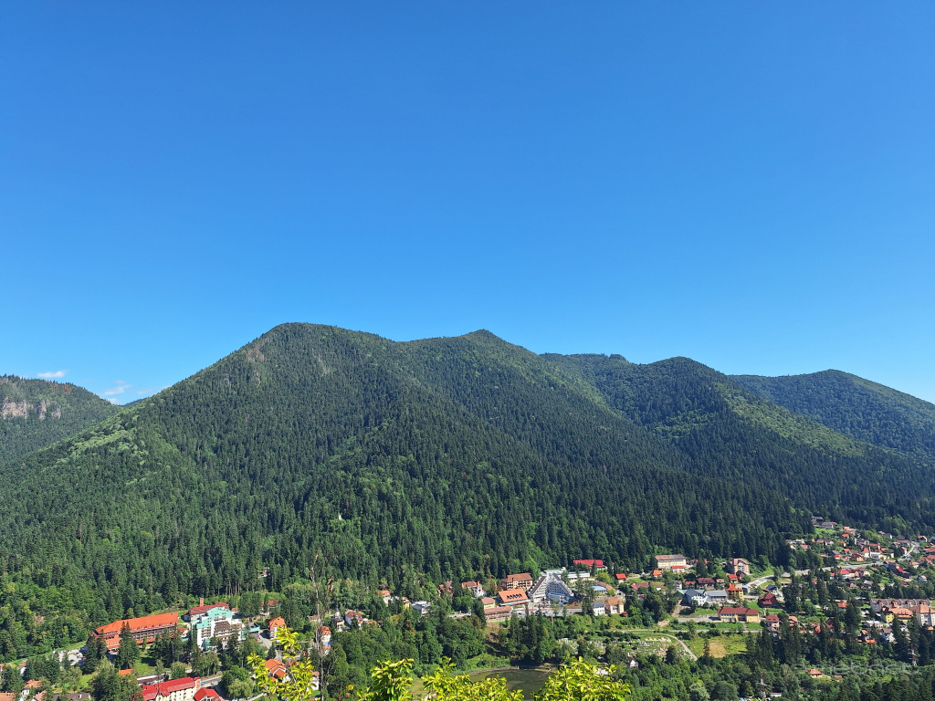 | Leírás: Tusnádfürdő a Solyóm-szikláról, szemben a Csomád tömbje | |