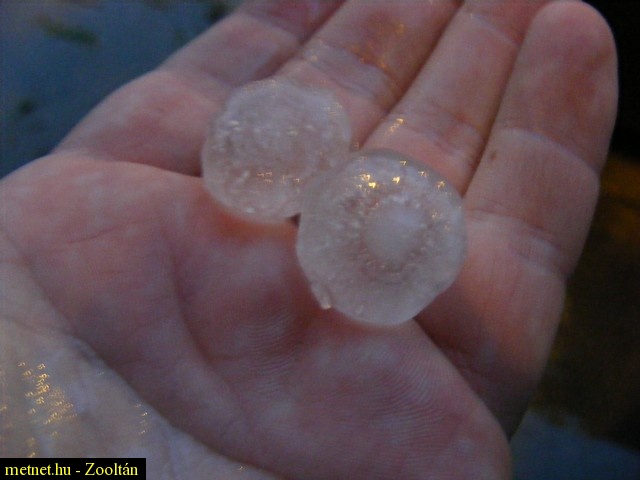 2010-05-26 10:03:30 - Kosakiss Hasonló jégdarabok hullottak sátrainkra Pádison, a Bihari-hegységben 1978. júliusában. Belül amorfak, fehér maggal, kivül légzárványokkal diszitett, áttetszõ burokkal.