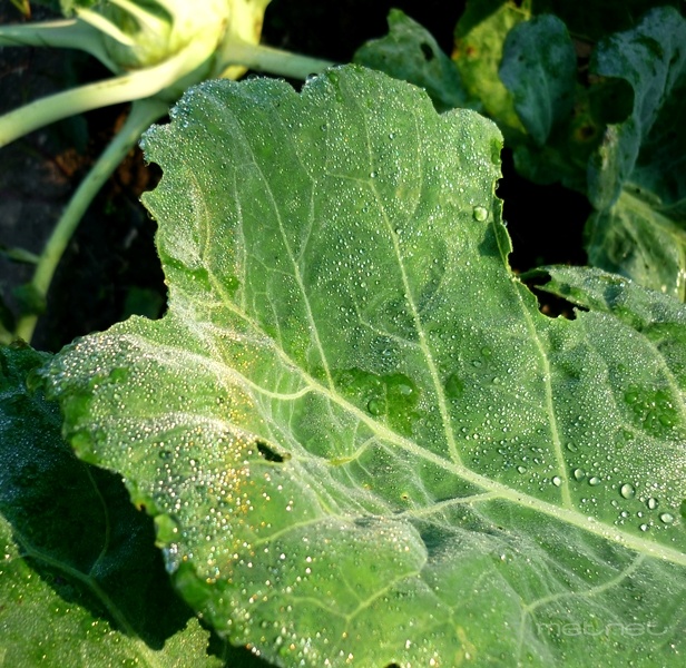 | Leírás: Karalábé levelén megtörõ harmatcseppek | |