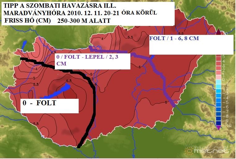 | Leírás: Hozzávetõleges hótipp az északnyugatról érkezõ peremciklonra -ill. melegfrontjára- (a tippbe az olvadást/elolvadást is próbáltam belevenni) | |