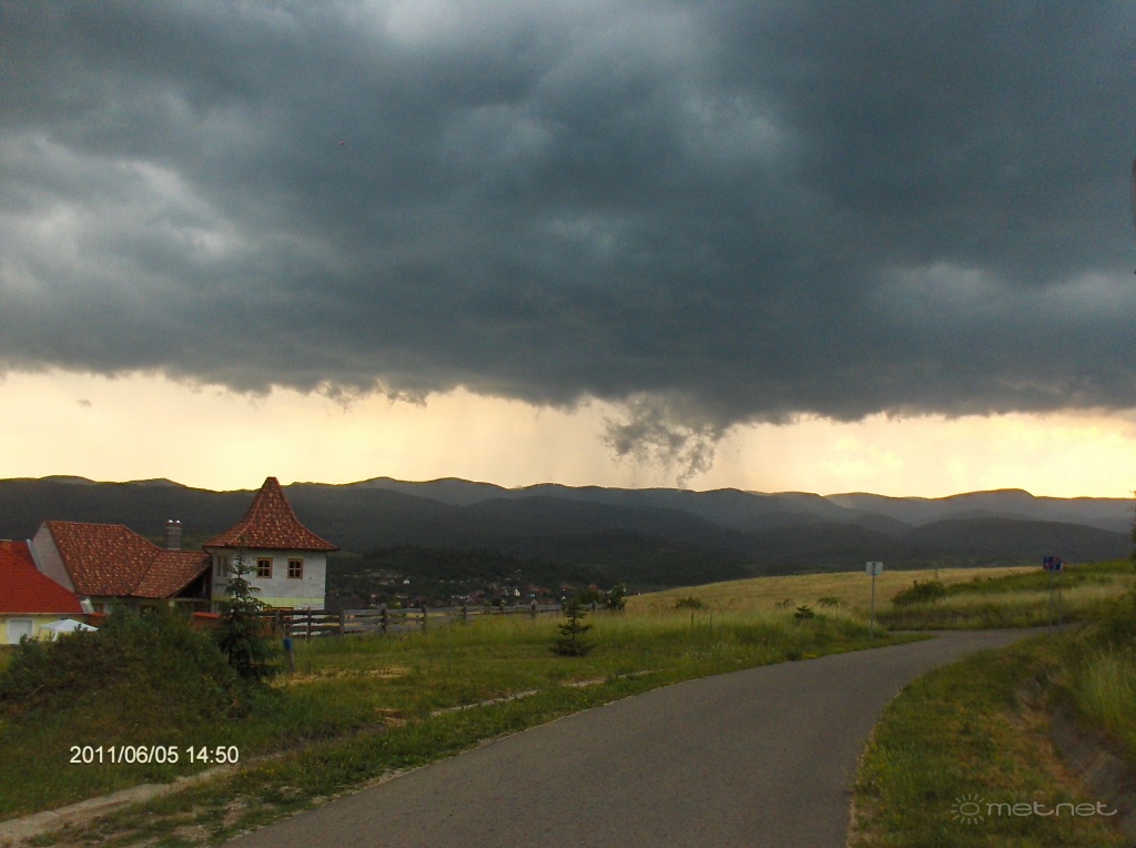 | Leírás: A Bükköt dél felõl elérõ délutáni zivatarrendszer. A Bükkalját megközelítve a vonalas elrendezõdés szegmentálódott, egyik ága Gyöngyöst, másik ága a Bükk keleti oldalát vette célba. Középtájon a Bükk északi oldalán eközben újult erõteljes konvekció indult: a radarképeken visszakövethetõ, hogy a Bükk északi oldalán újabb cella alakult ki, íme a születése. Tornádóról nincs szó, ám a feláramlás erejét jól példázzák a képek. | |