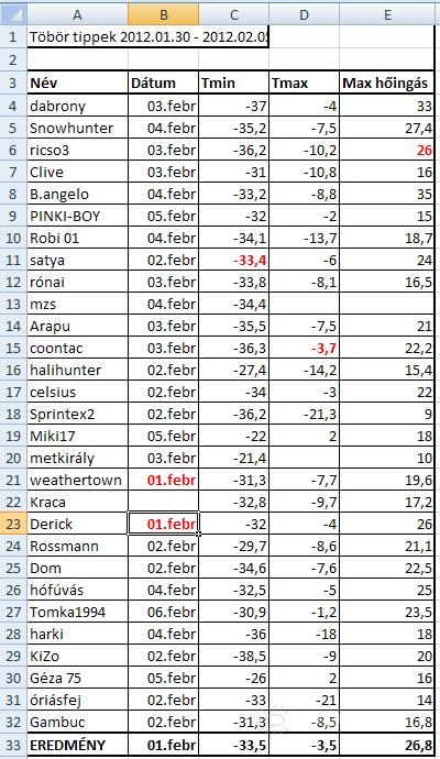 | Leírás: Töbör tippek és eredményei a 2012.01.30- 02.05 közötti idõszakról. Tmin: -33,5°C 02.01-én; Tmax: -3,5°C; Max. napi hõingás: 26,8°C. |