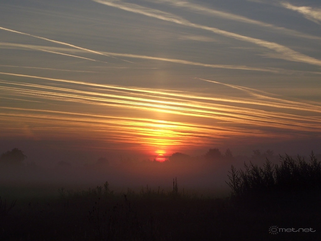 Leírás: Naposzlop napkeltekor, sekély köddel.