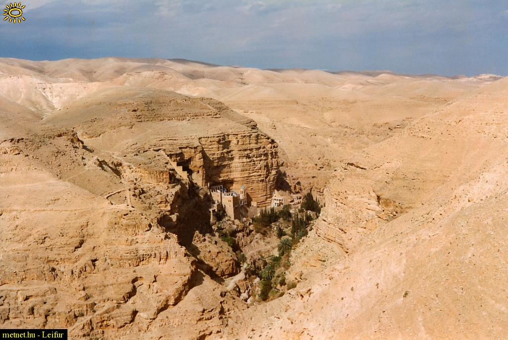 | Leírás: Görögkeleti kolostor a Júdeai-sivatag egy vádijának oázisában. | |