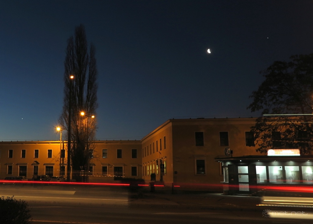 | Leírás: Gépjárművek fényszóróinak csíkja a Vénusz, Hold, Jupiter, valamint a vasútállomás előtt. | |