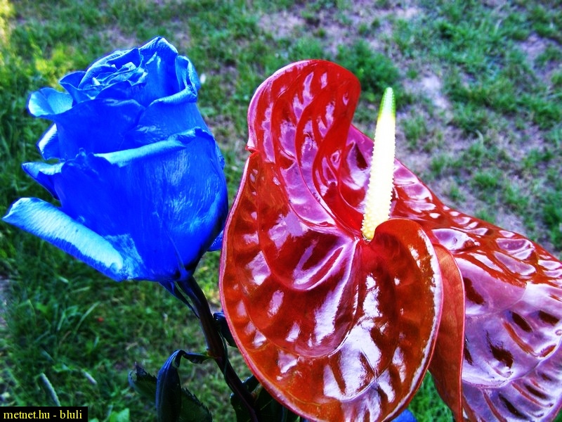 Leírás: Kék rózsa, ami természetesen festve van, és egy flamingóvirág. A ballagási csokraim között voltak. :) |