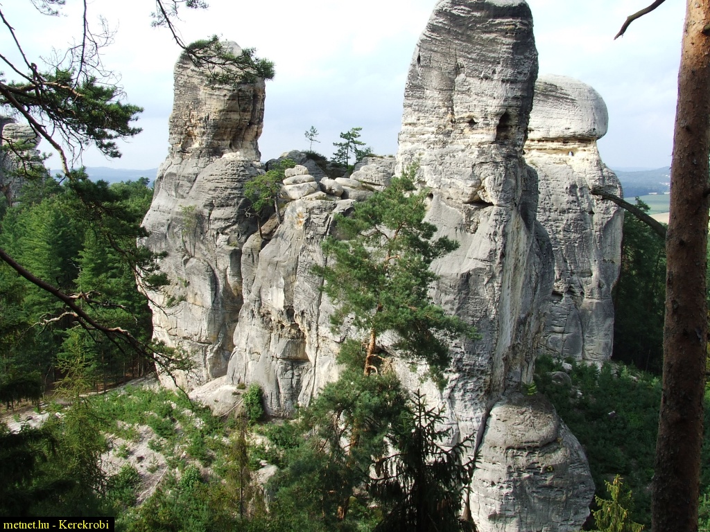 | Leírás: Cesky-Raj igazi nagy homokkõ sziklák. Átlagos magasságuk 20-40 m közötti. A külsõ erõk hatására a sziklák mállanak, porladnak. Összetételük homokkõ, ami változatos szemcseméretet mutat. | |