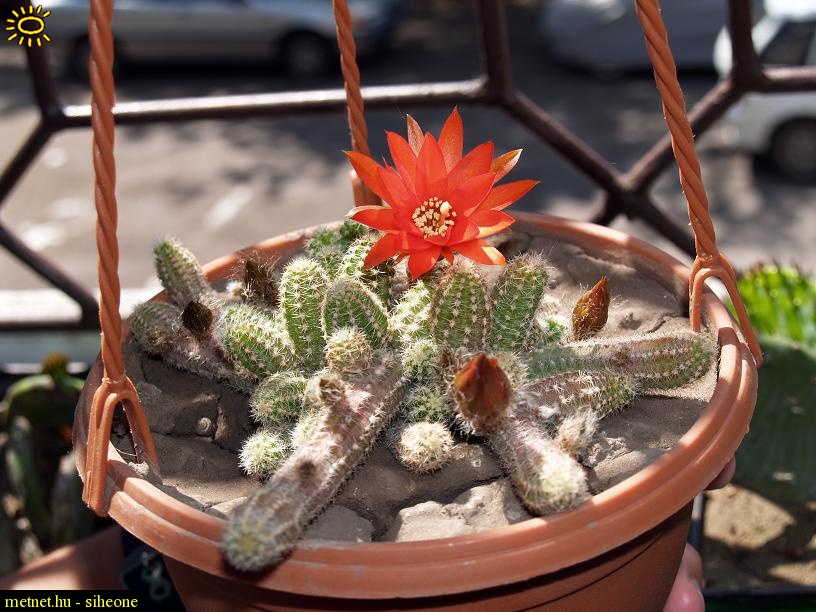 | Leírás: Chamaecereus silvestrii. Argentinából származó, párnásan növõ faj, élénk piros virágokkal. Sokan nem tudják, de szárazon tartva télen a -18C fokot is elviseli. Egyébként errõl az anyanövényrõl eddig 12 cseréppel tudtam eldugványozni kaktuszokat. |