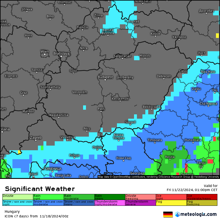 Hétfőn este melegfront érkezik, ami főként északra és keletre hoz csapadékot, zömében havat, de előfordul majd vegyes halmazállapotú csapadék is.