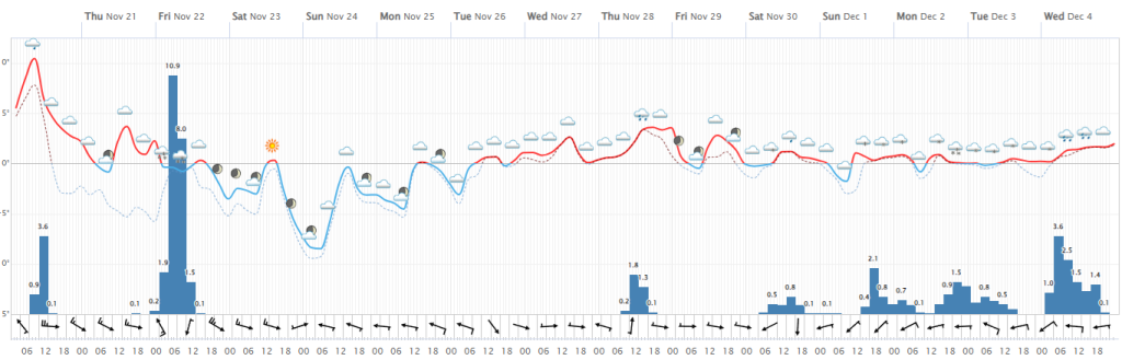 Hétfőn este melegfront érkezik, ami főként északra és keletre hoz csapadékot, zömében havat, de előfordul majd vegyes halmazállapotú csapadék is.