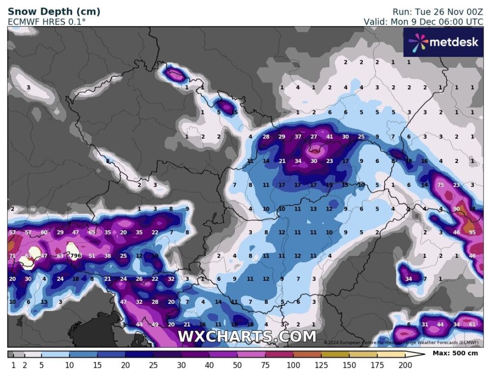 Hétfőn este melegfront érkezik, ami főként északra és keletre hoz csapadékot, zömében havat, de előfordul majd vegyes halmazállapotú csapadék is.
