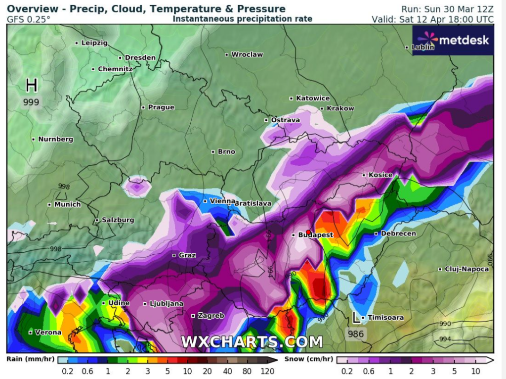 Hétfőn este melegfront érkezik, ami főként északra és keletre hoz csapadékot, zömében havat, de előfordul majd vegyes halmazállapotú csapadék is.