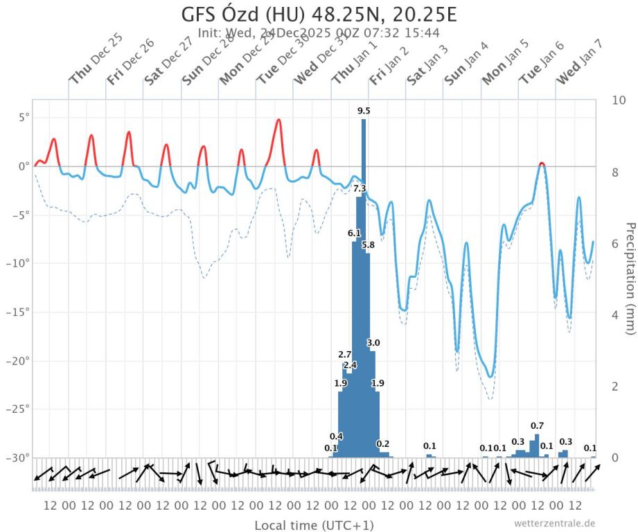 Hétfőn este melegfront érkezik, ami főként északra és keletre hoz csapadékot, zömében havat, de előfordul majd vegyes halmazállapotú csapadék is.
