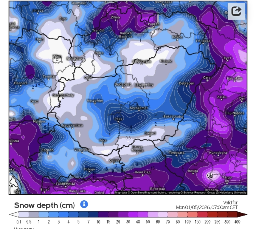 Hétfőn este melegfront érkezik, ami főként északra és keletre hoz csapadékot, zömében havat, de előfordul majd vegyes halmazállapotú csapadék is.
