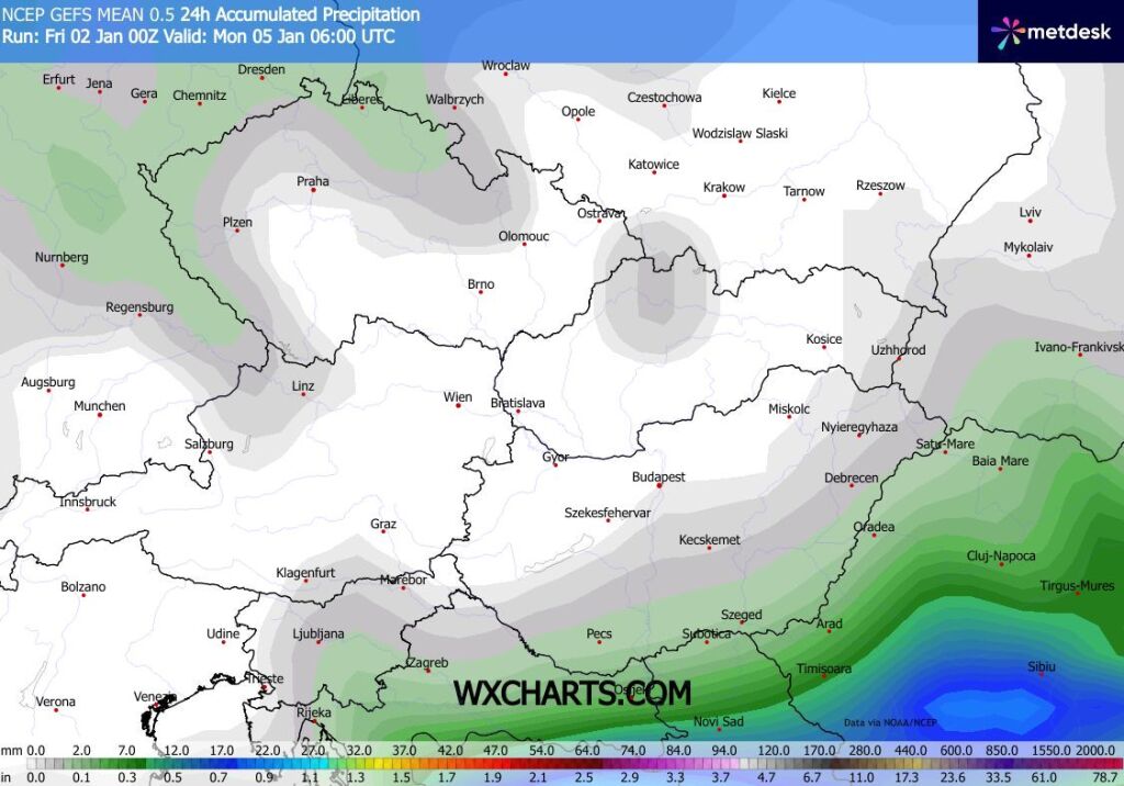 Hétfőn este melegfront érkezik, ami főként északra és keletre hoz csapadékot, zömében havat, de előfordul majd vegyes halmazállapotú csapadék is.