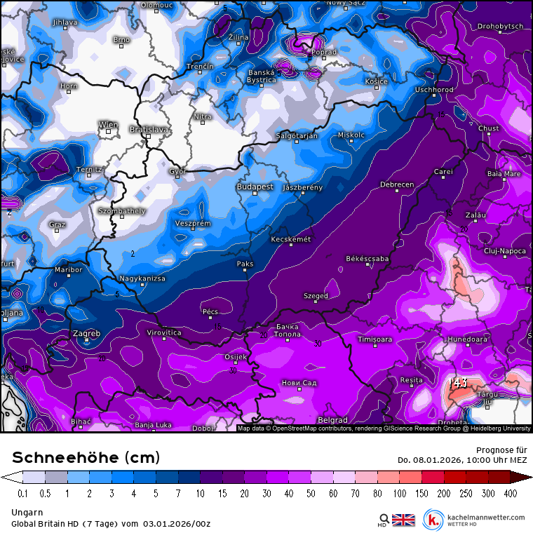 Hétfőn este melegfront érkezik, ami főként északra és keletre hoz csapadékot, zömében havat, de előfordul majd vegyes halmazállapotú csapadék is.