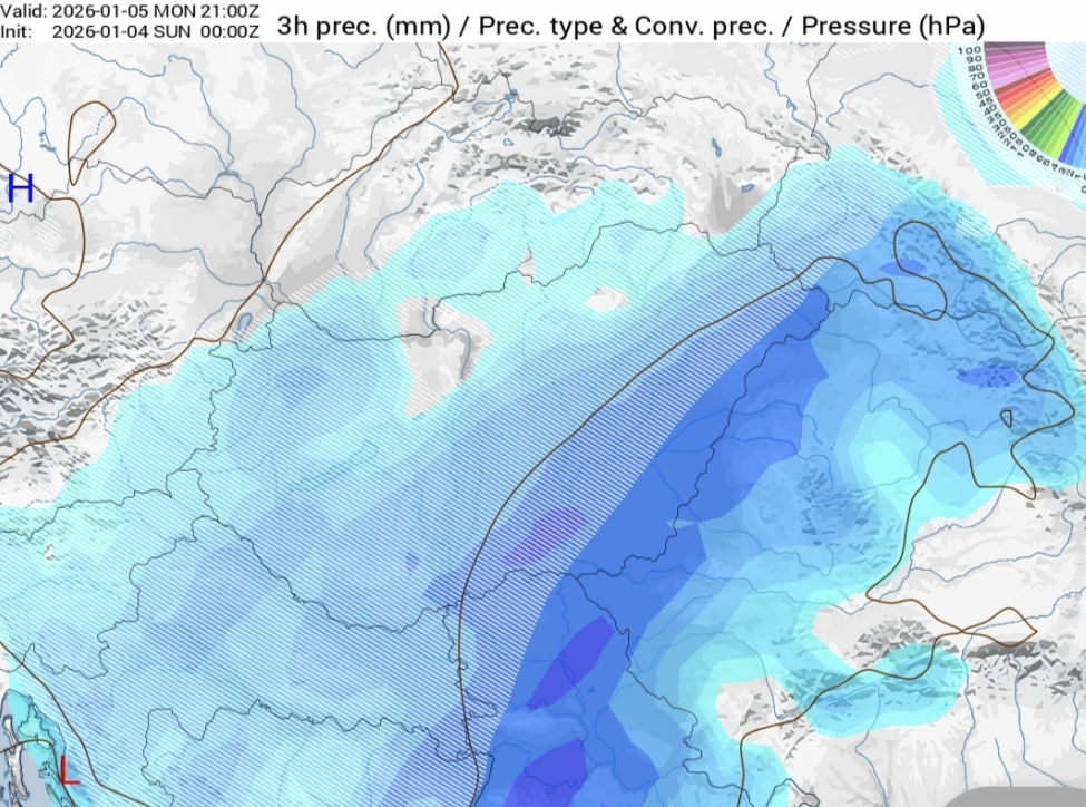 Hétfőn este melegfront érkezik, ami főként északra és keletre hoz csapadékot, zömében havat, de előfordul majd vegyes halmazállapotú csapadék is.