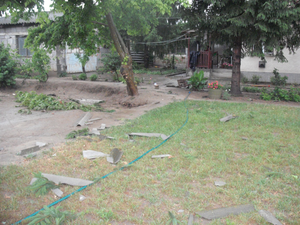 | Leírás: Pénteken, 06. 30-án, hatalmas erejû szél tarolt Borota egyik utcájában,délután 17 óra 45 perc körül. 15 házat rongált meg. Erejét a képek mutatják.Mindenütt törött cserepek, paladarabok, kidöntött, kettétört fákat hagyott maga után.Véleményem szerint forgó szél lehetett. | |