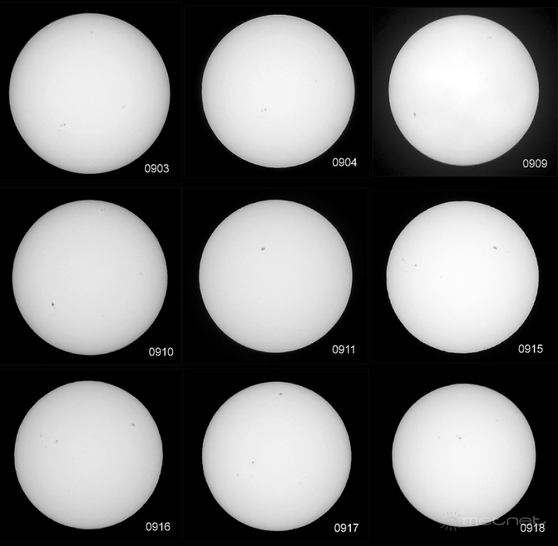 | Leírás: 9 nap napfoltjai (nem ugyanazzal a fényképezõvel és nem azonos idõpontban készültek, ezért van eltérés a méretben és a foltok állásában) | |
