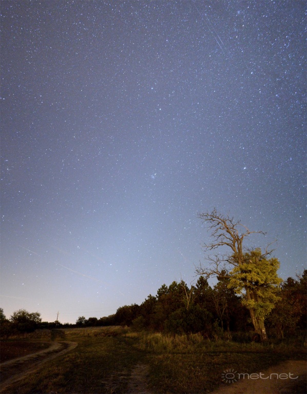 | Leírás: Gyönyörû állatövi fény, a kép tetején két halványat villanó mûhold | |