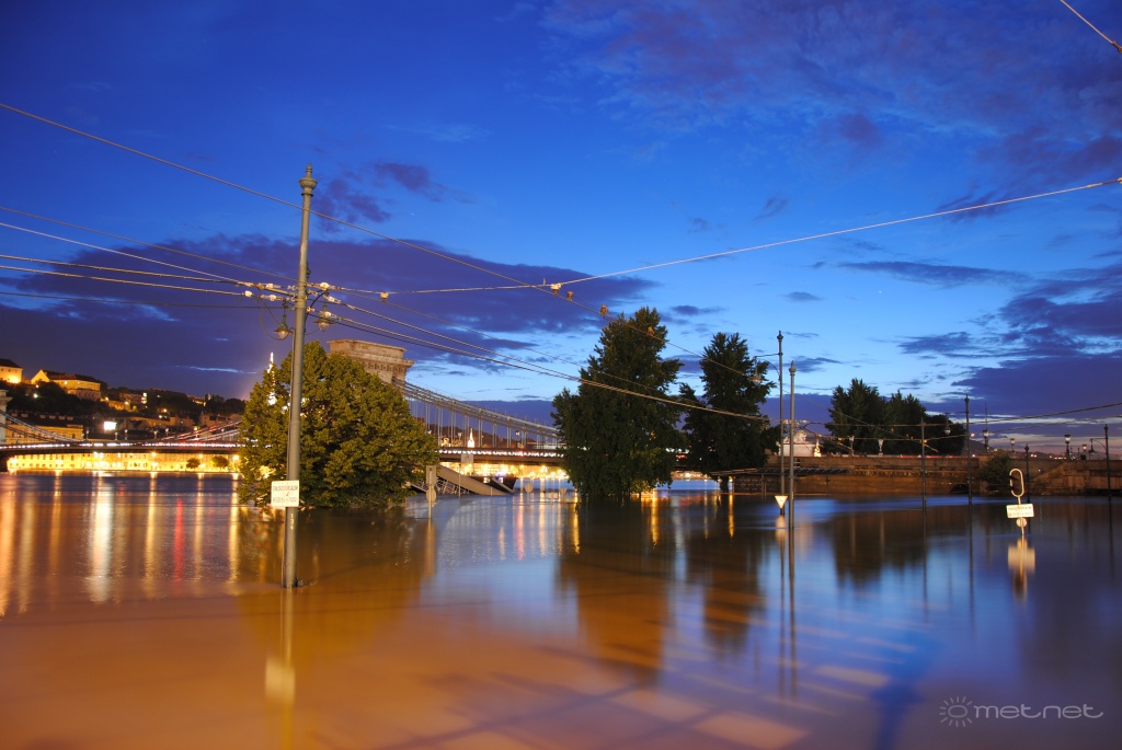 Leírás: Az áradó Duna és a díszkivilágítás nélküli Lánchíd.