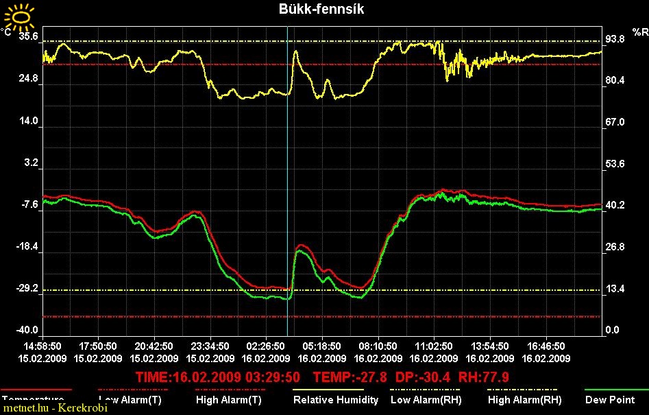 Leírás: Bükk-fennsík; fagyzug mérés. 2 m magasságban, egy töbör alján, árnyékolóval ellátva, mért hõmérsékleti értékek. 2009.02.14-20 között. Adat tároló tipusa: Volcraft; DL-120 TH; 1 perces mintavételi beállítással. Színek: piros: hõmérséklet; zöld: harmatpont; sárga: relatív páratartalom.