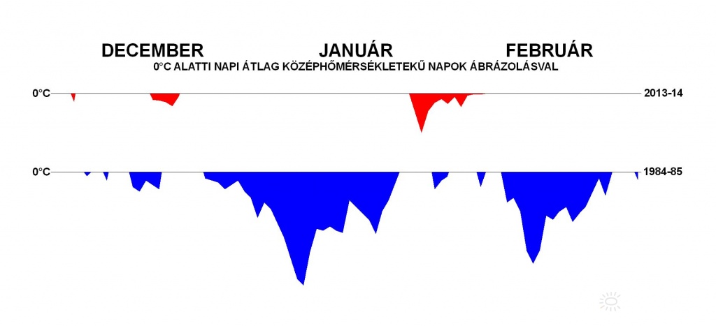Leírás: 1984-85 és 2013-14 telének grafikonos összehasonlítása a 0°C alatti középhõmérsékletû napok ábrázolásával. |