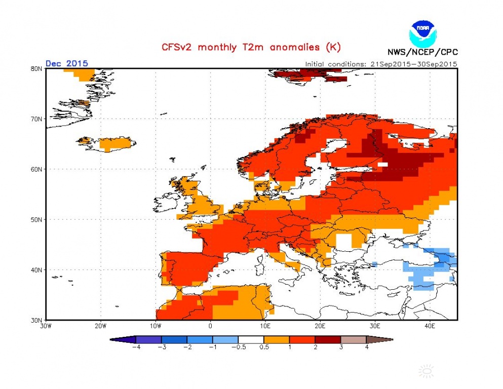 Leírás: A CFSv2 modell elõrejelzése 2015 decemberére. A modell a 2015.09.21-30, közötti idõszakot, mint kezdeti feltételt veszi figyelembe. Magyarországra +0.5 és +1 fok körüli anomáliával számol. ( f: http://www.cpc.ncep.noaa.gov )