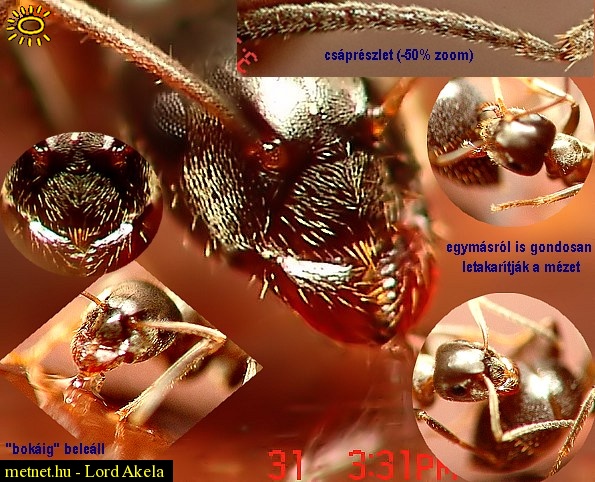 Leírás: A kisebb testméretû hangyák élénken kutatnak (a nagyobb vöröseket még nem látom) Pár csepp mézzel helybenmaradásra bírtam õket, de "evés" közben is élénken mozognak, bemozdulnak. Sajnos a vaku itt-ott fehér foltokat produkált. "Tanulom" fotózásukat, lesz jobb is :) EXIF F5,6 ISO64 1/250sec (Sony F828) Videofelvétel is van a "nagy zabálásról" :)