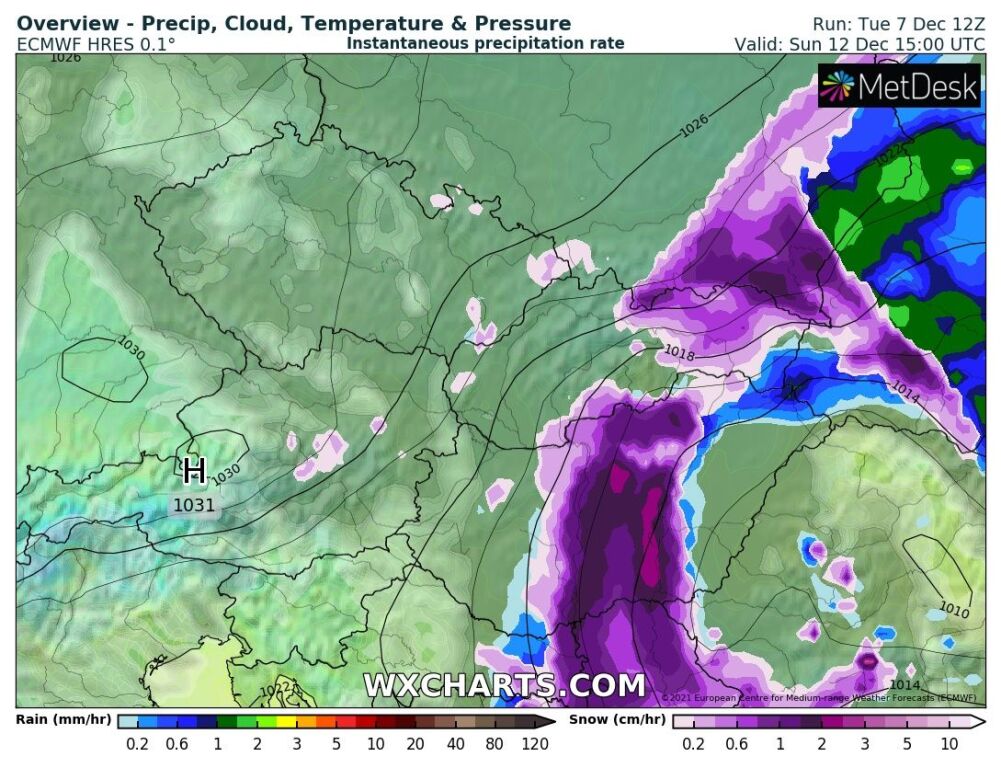 Hétfőn este melegfront érkezik, ami főként északra és keletre hoz csapadékot, zömében havat, de előfordul majd vegyes halmazállapotú csapadék is.