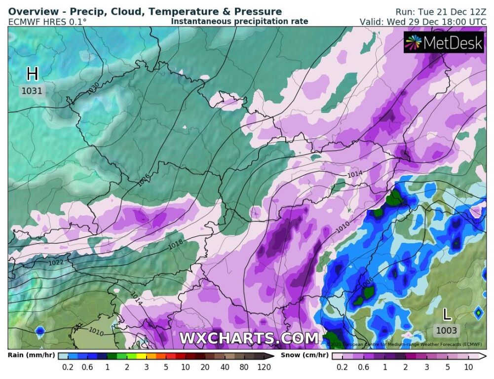 Hétfőn este melegfront érkezik, ami főként északra és keletre hoz csapadékot, zömében havat, de előfordul majd vegyes halmazállapotú csapadék is.