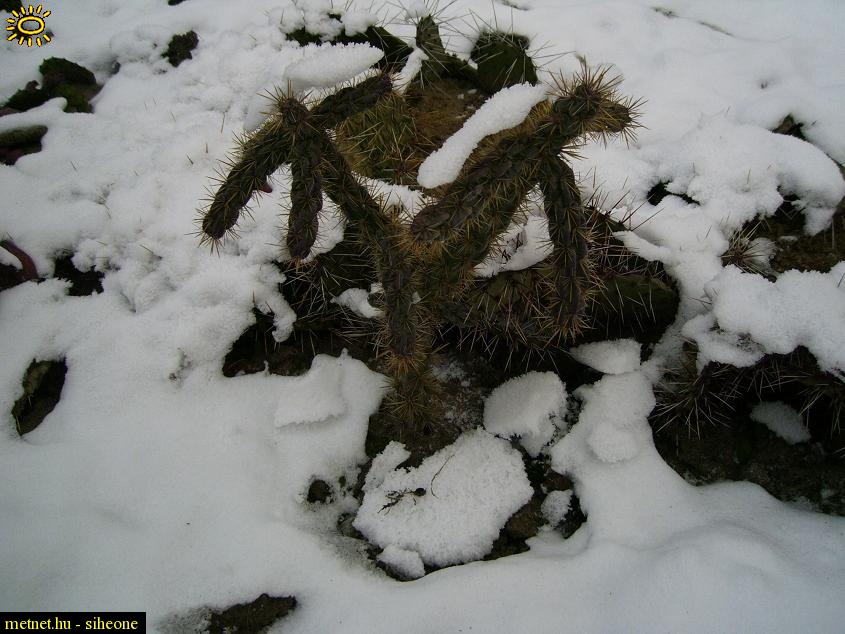 | Leírás: Tudom kissé bizarr látvány, de a télálló kaktuszoknál ez nem meglepõ. Sõt!!! Igénylik is a sok hideget a tavaszi bõséges virágzáshoz. Egyébként itt a Cylindropuntia imbricata kaktusz látható. (Akár 3 méteresre is megnövõ faja) |