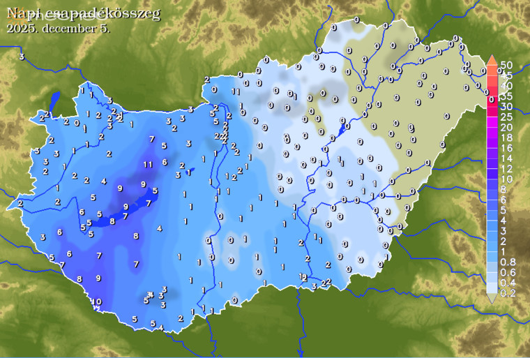 Jellemzően 7 és 11 mm közötti csapadék hullott az említett területeken, másutt ennél kevesebb csapadék hullott.
