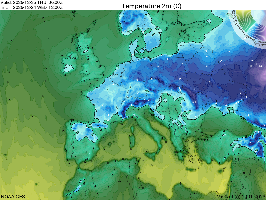 Miközben nálunk a mediterrán ciklon miatt többnyire pozitív tartományban marad a hőmérséklet (kivétel nyugat és északkelet), addig tőlünk északra bizony keményen fagyosan indul a karácsony első napja.